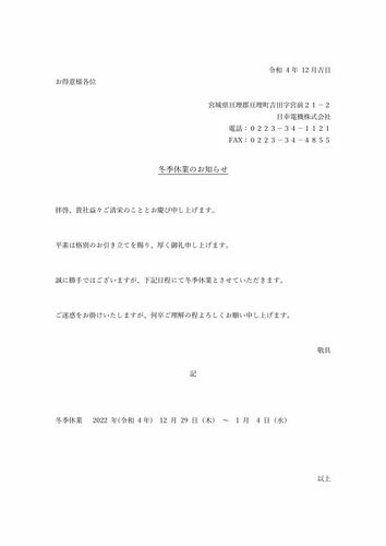 2022年冬季休業のお知らせ(日幸電機株式会社) www.youtube.com 日幸電機株式会社問い合わせフォーム 【2022年4月1日から日幸電機株式会社は再エネ100%電気(RE100)を採用!】 日幸電機では二酸化炭素排出削減への取り組みの一環として、2022年4月1日より亘理…
